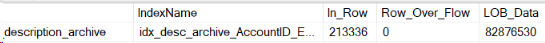 The results show that the majority of this table data is stored in LOB type pages instead of in-row, because the “description” field is composed of values mostly > 8,000 bytes.![]()