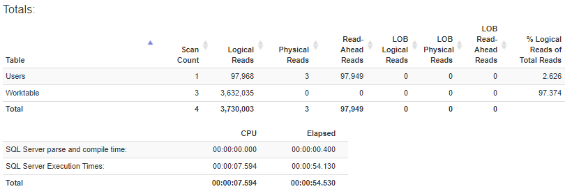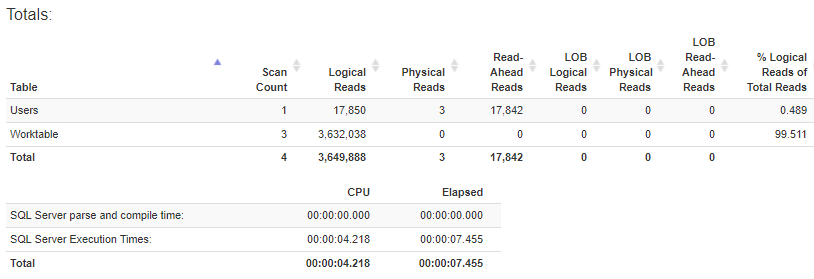 As a reminder, here is the result of our IO and time stats when we ran the query against our Users table before partitioning and changing any indexes: