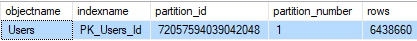 USE StackOverflow; GO SELECT o.name objectname,i.name indexname, partition_id, partition_number, [rows] FROM sys.partitions p INNER JOIN sys.objects o ON o.object_id=p.object_id INNER JOIN sys.indexes i ON i.object_id=p.object_id and p.index_id=i.index_id WHERE o.name = 'Users'