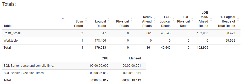 As a test, I created a “small” version of the dbo.Posts table, removing any of the string fields, since they are not relevant to the analytics I am doing in my made up world of magical data goodness. I then copied all the data from dbo.Posts to dbo.Posts_small table. I created the separate slimmed down version of Posts to simulate having a “reporting” version of the Production Posts table, as would happen IRL. Of course, as of SQL Server 2017, you could recreate the Posts table as a clustered columnstore and have the benefit of better analytics query performance on your OLTP table. But that idea makes me cringe, and want to hide under my covers. Reporting on PROD brings out the grouchy DBA in me!