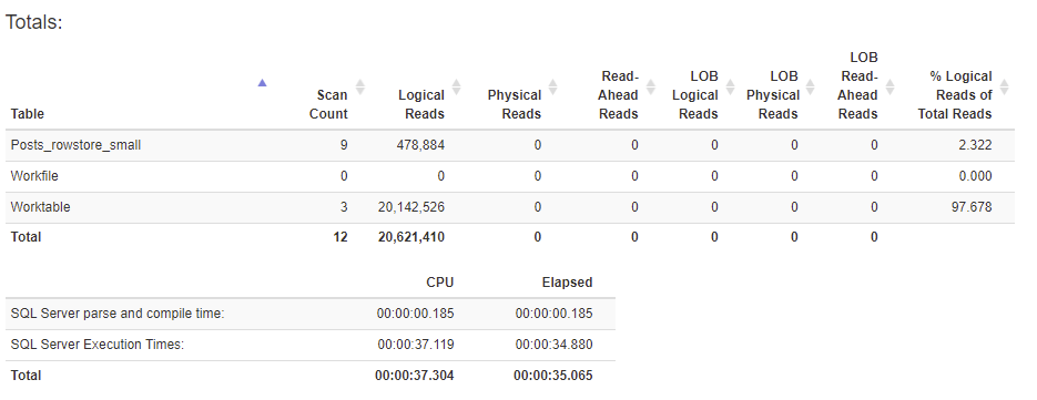 The results for each query are shown below. First the rowstore version. Notice the huge number of Logical Reads!